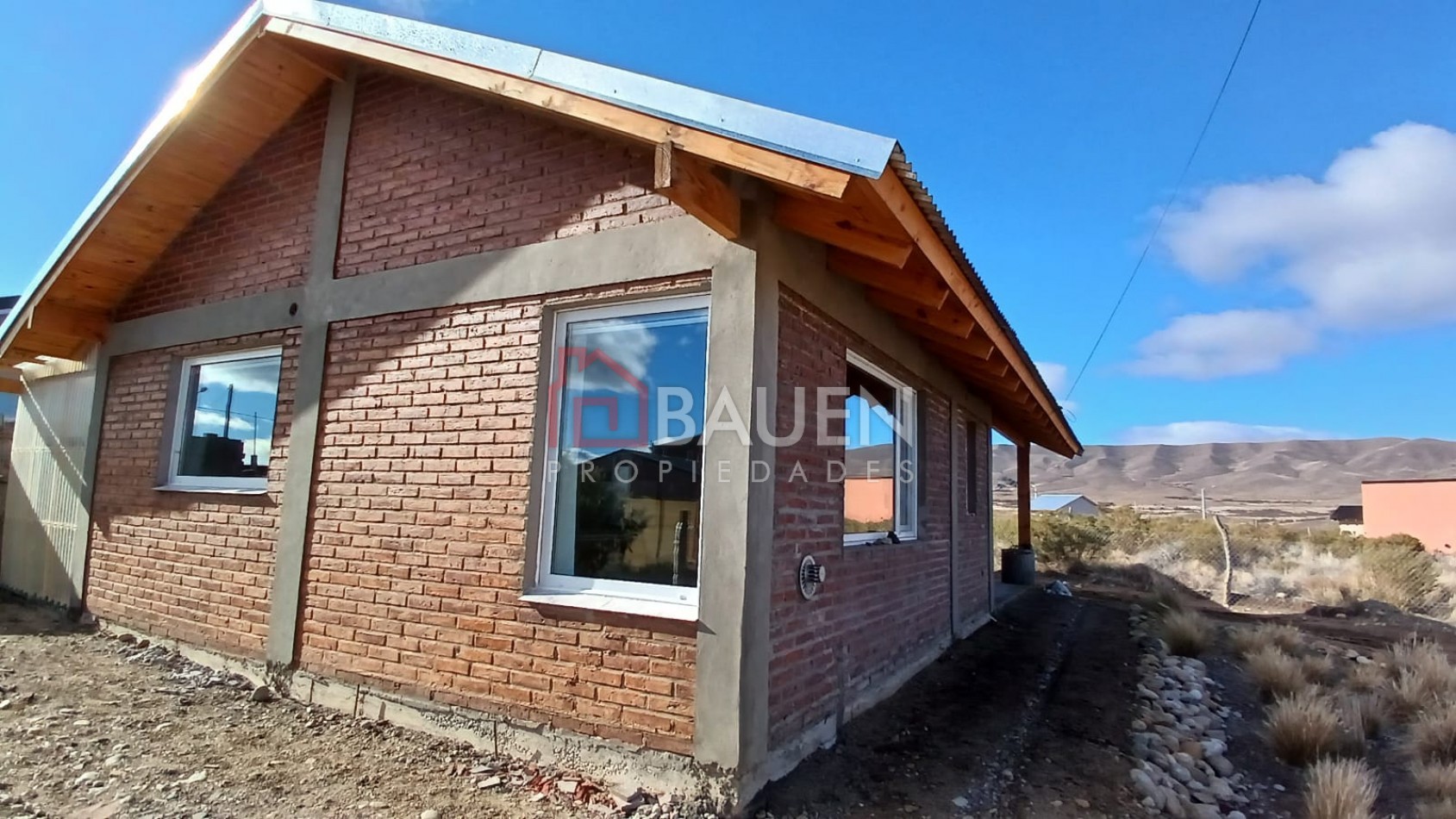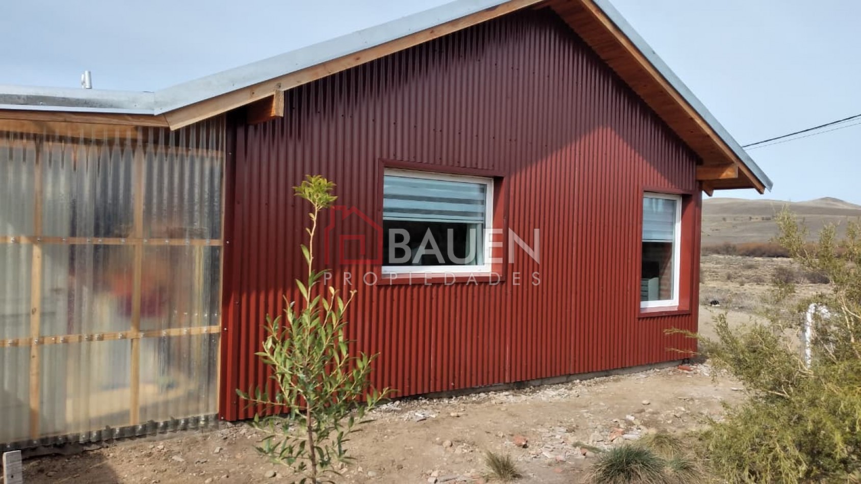 ​Revestimiento exterior: La parte de la pared oeste está cubierta con chapa acanalada de un color terracota, lo que le da un aspecto robusto y moderno común en climas con condiciones variables . En su frente toda de ladrillo visto, aberturas doble vidrio en pvc.
