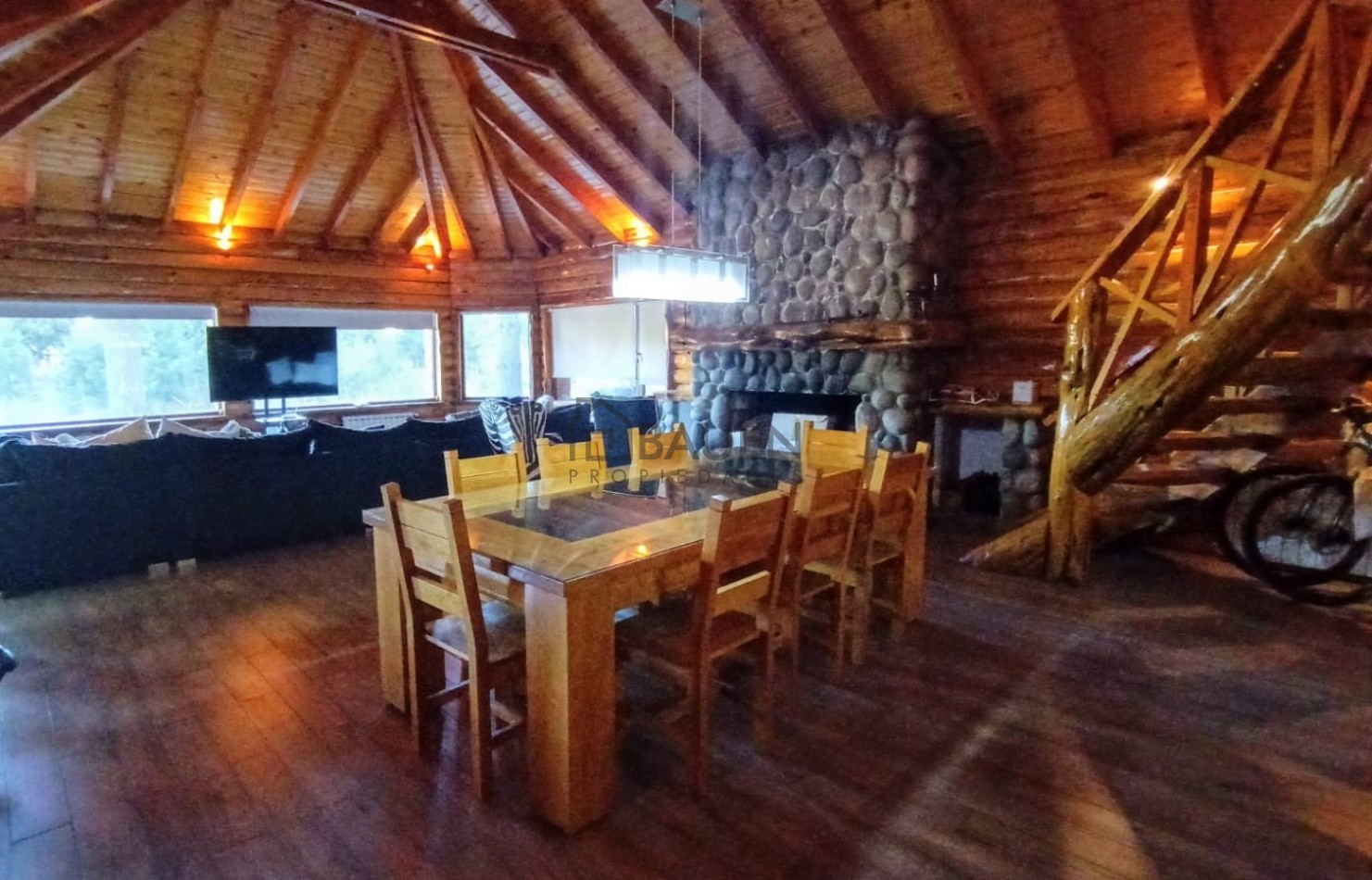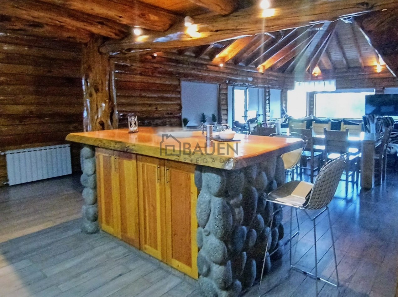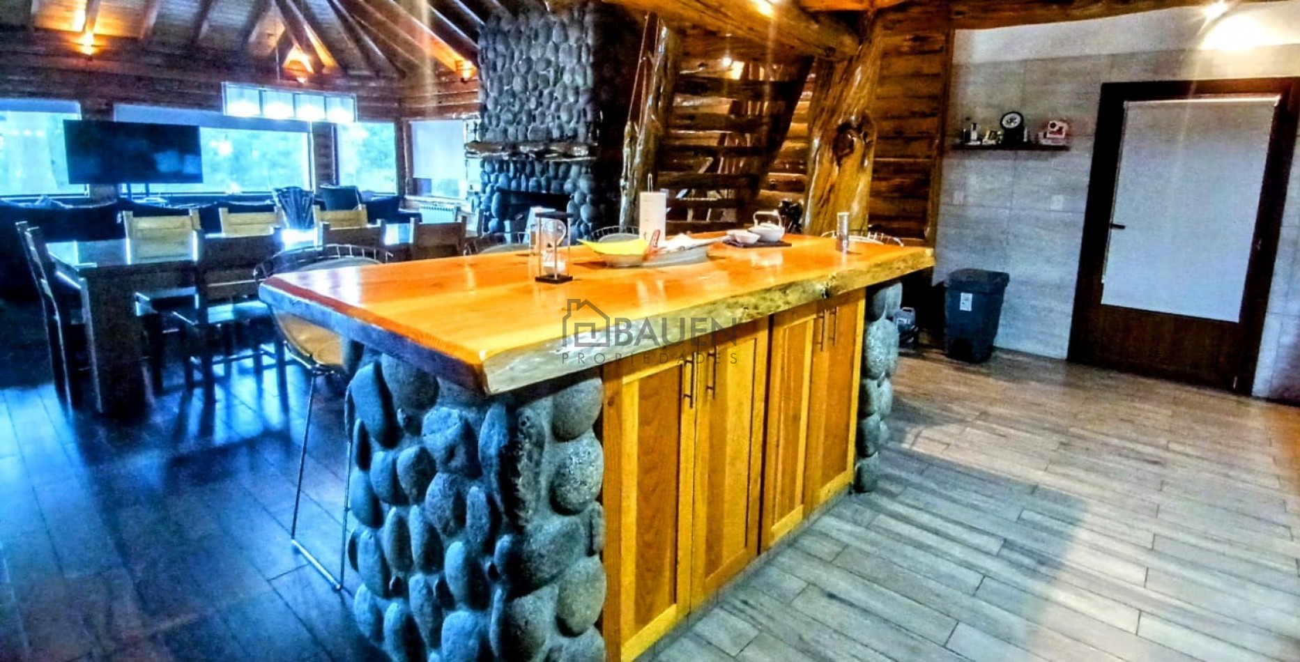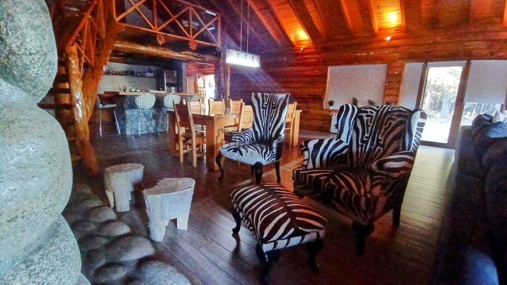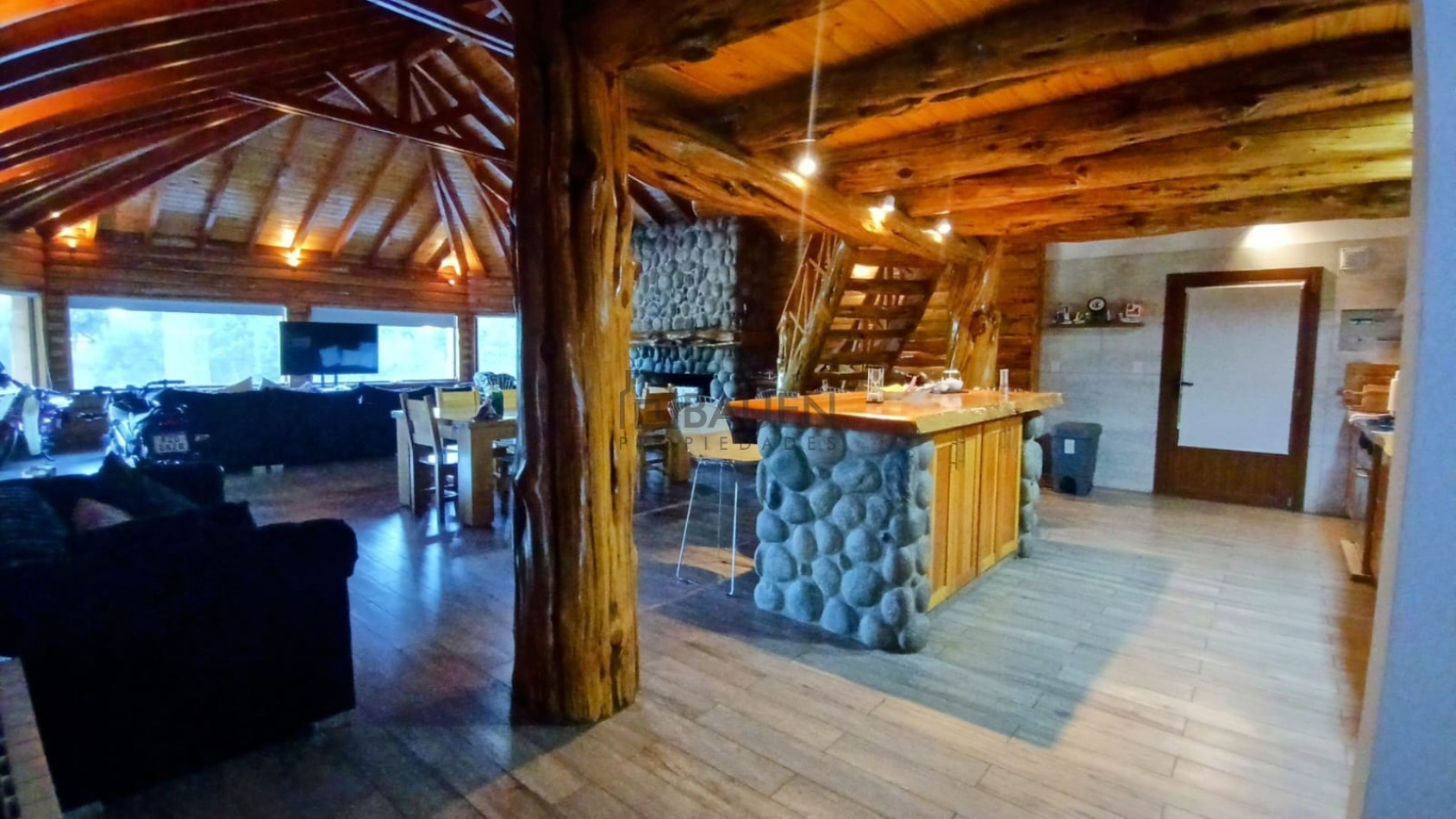*La casa tiene revestimiento de troncos de madera y base de piedra bocha en el exterior y mantiene el mismo estilo en el interior.