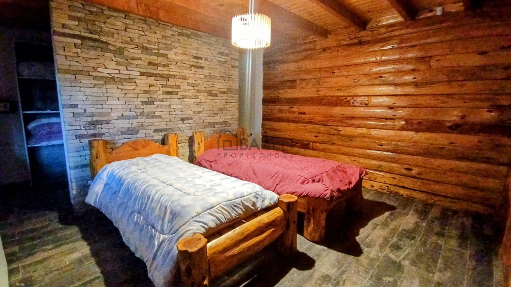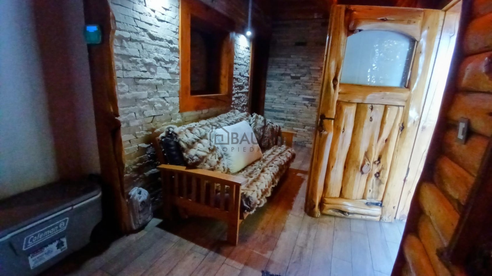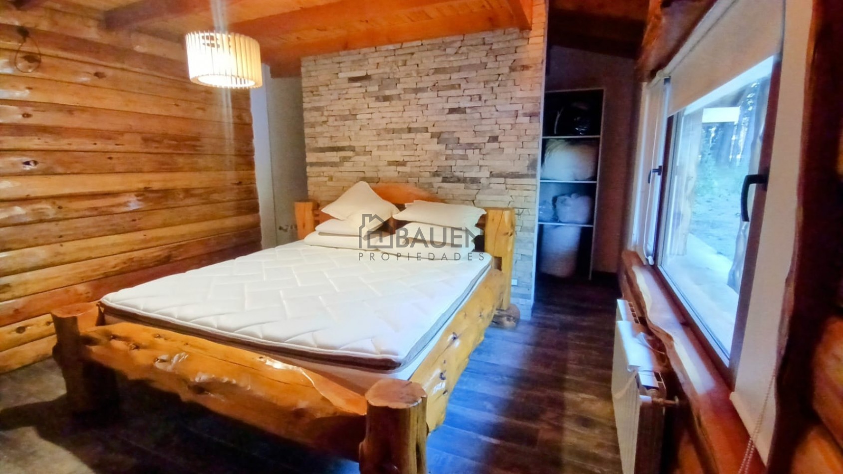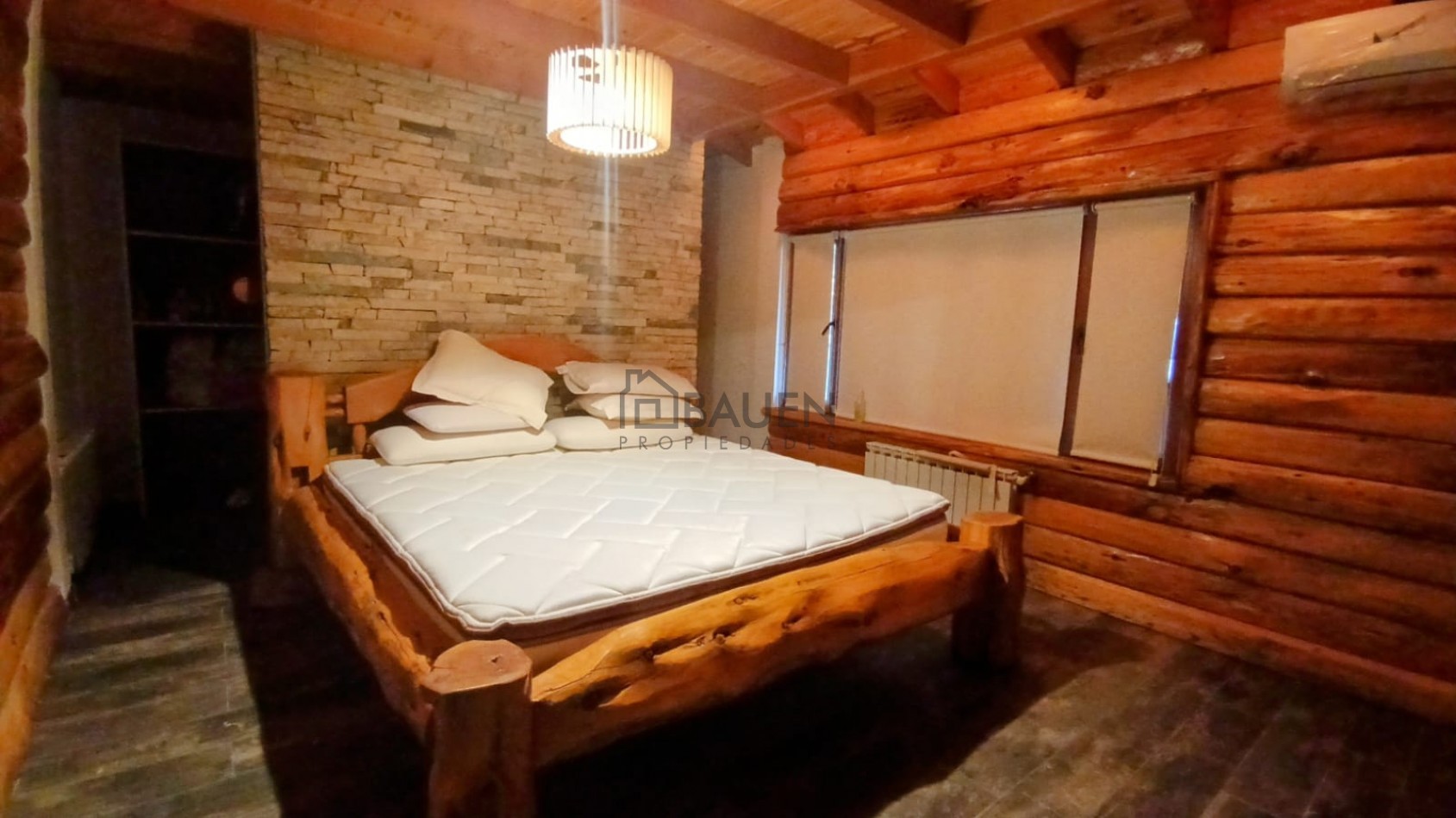 *La casa tiene revestimiento de troncos de madera y base de piedra bocha en el exterior y mantiene el mismo estilo en el interior.
