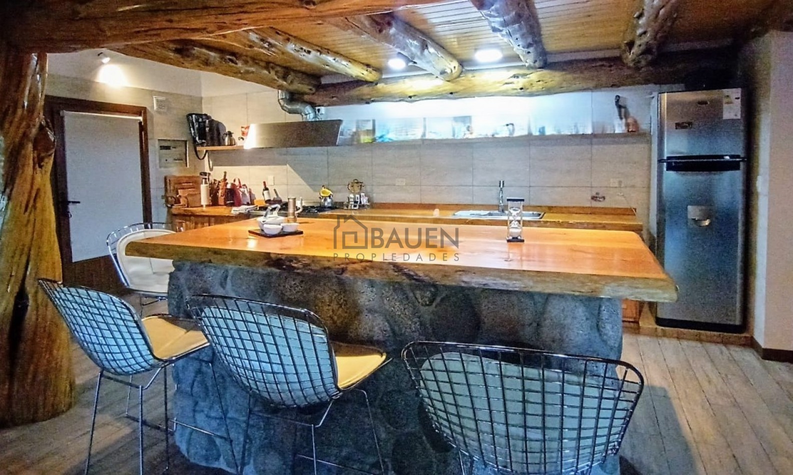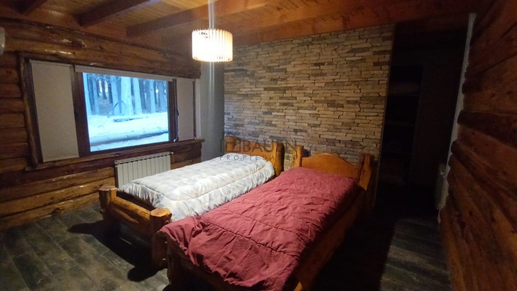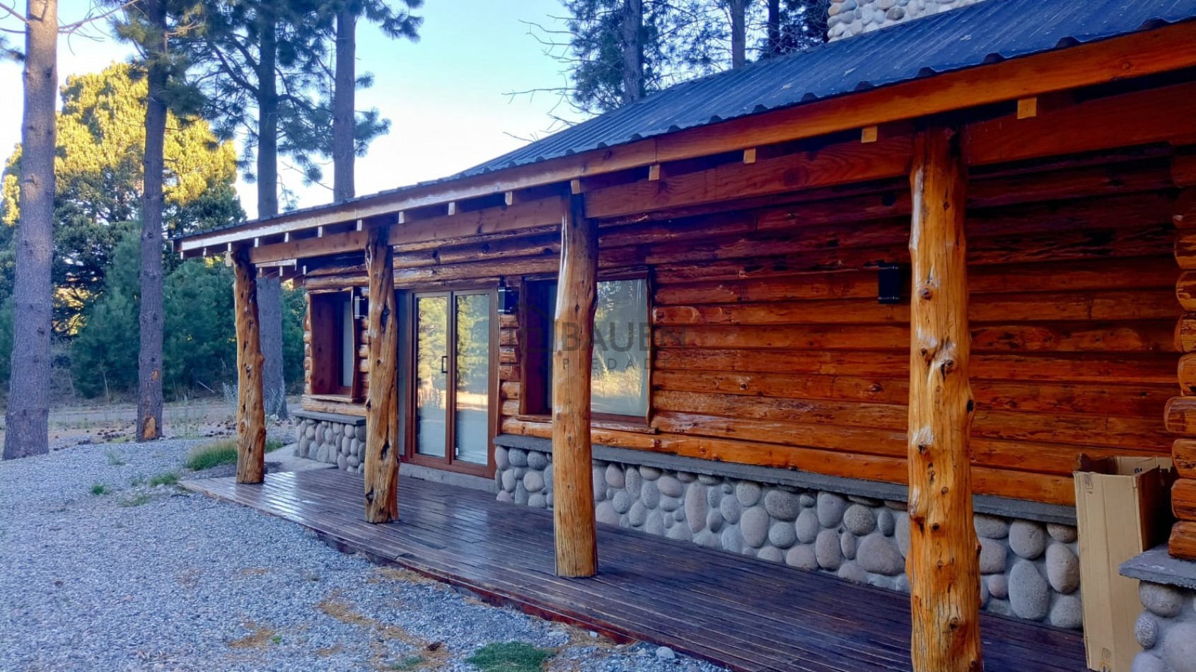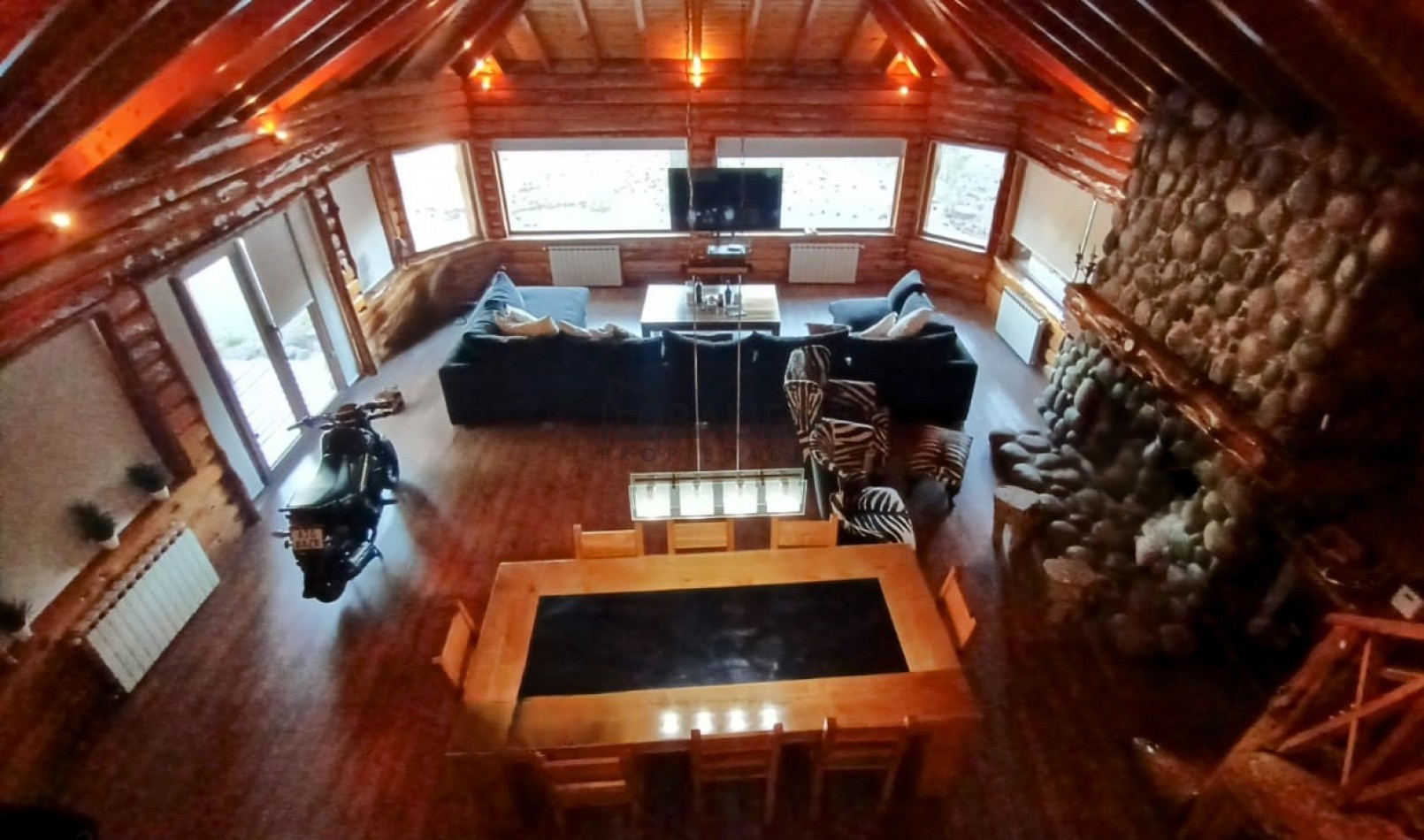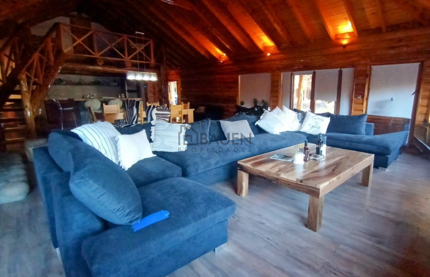 *La casa tiene revestimiento de troncos de madera y base de piedra bocha en el exterior y mantiene el mismo estilo en el interior.