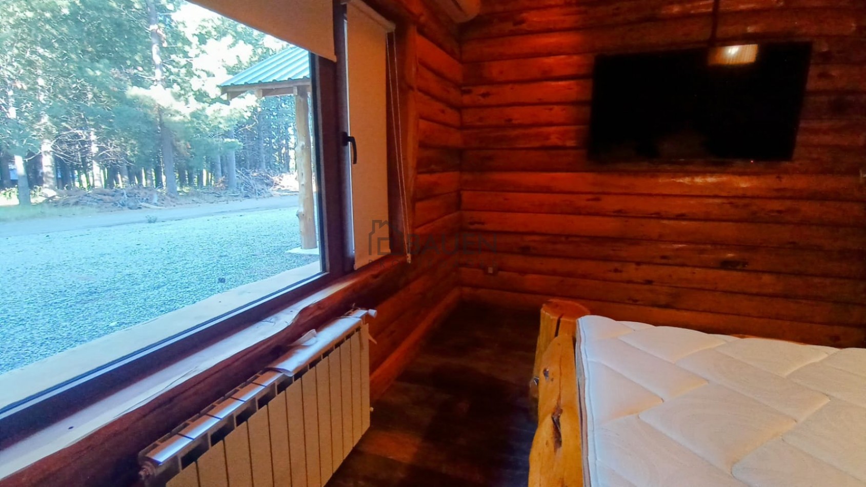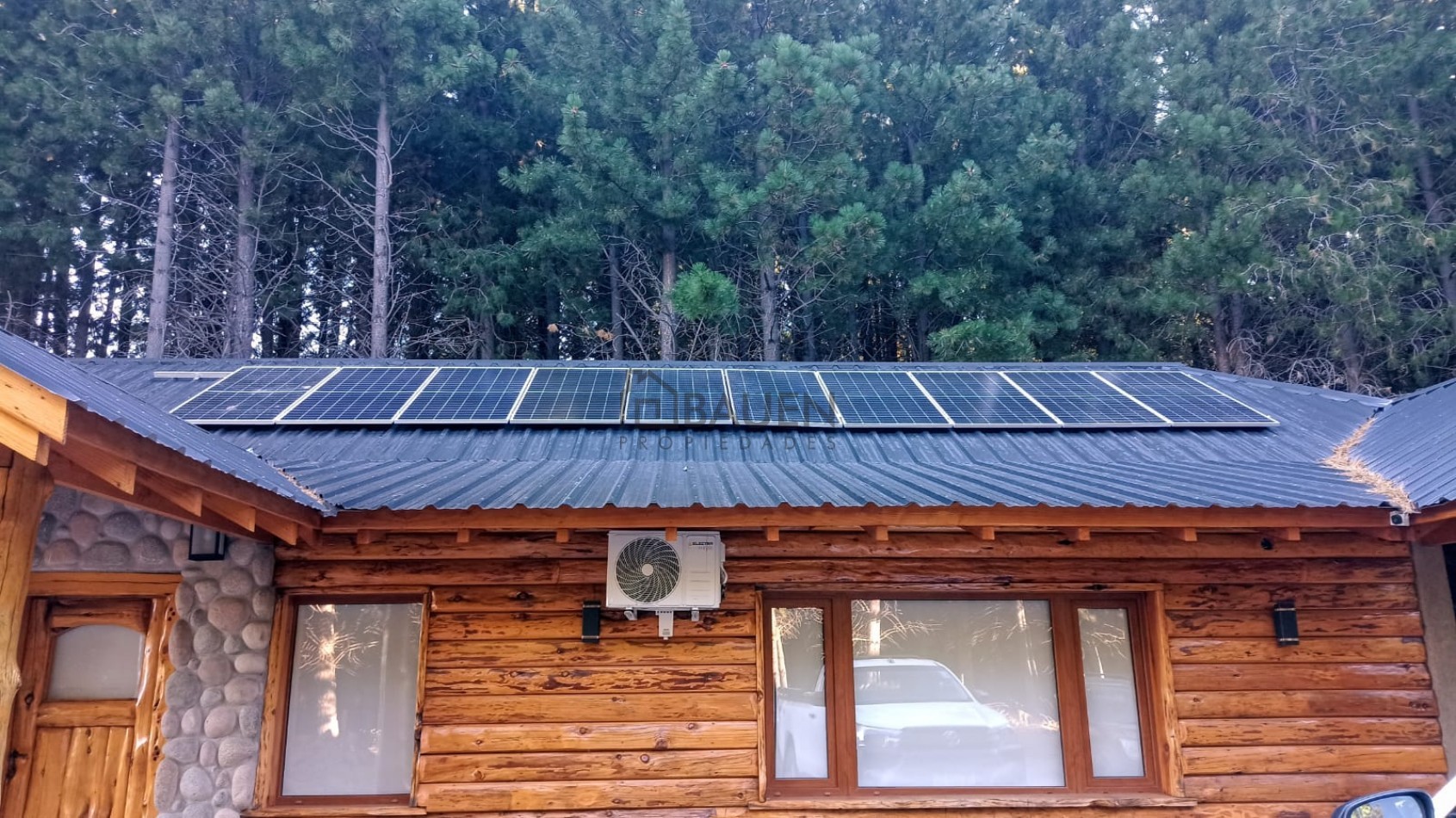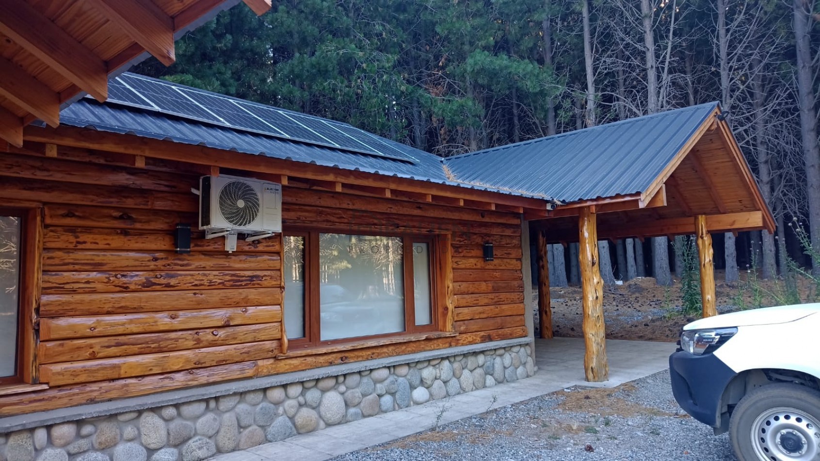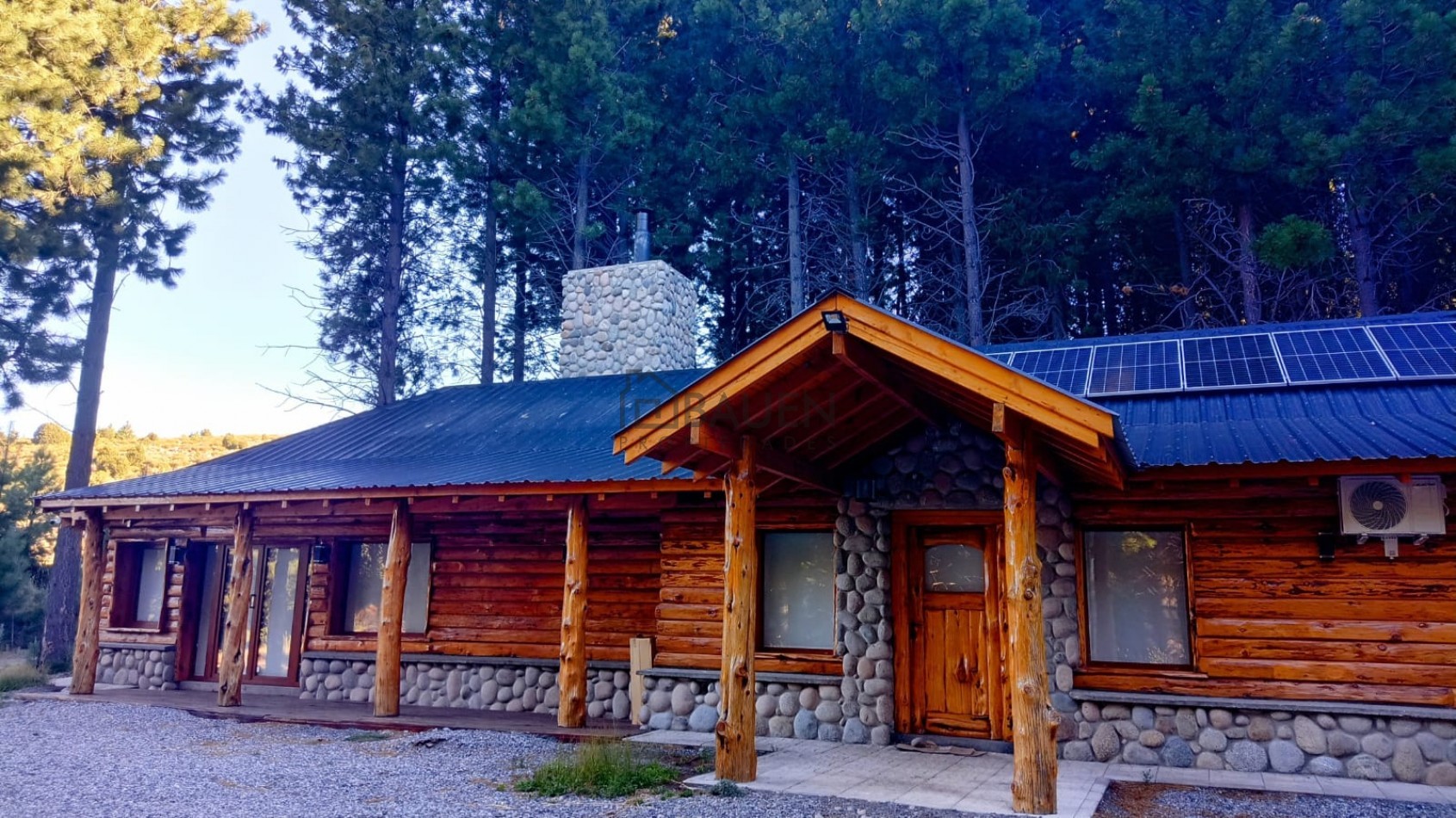 *La casa tiene revestimiento de troncos de madera y base de piedra bocha en el exterior y mantiene el mismo estilo en el interior.