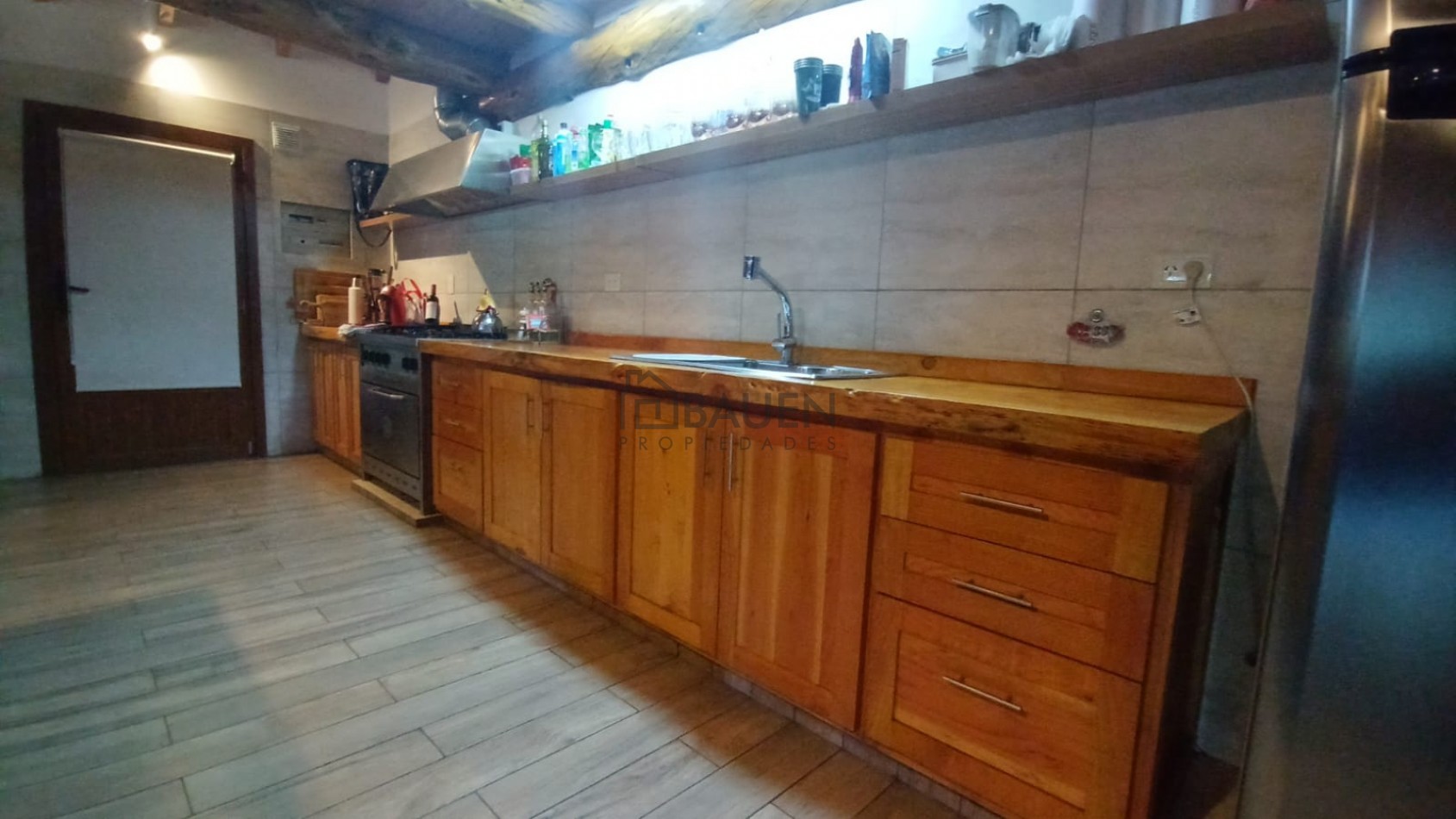 Living comedor con gran hogar a leña, cocina con isla y buen espacio de guardado.